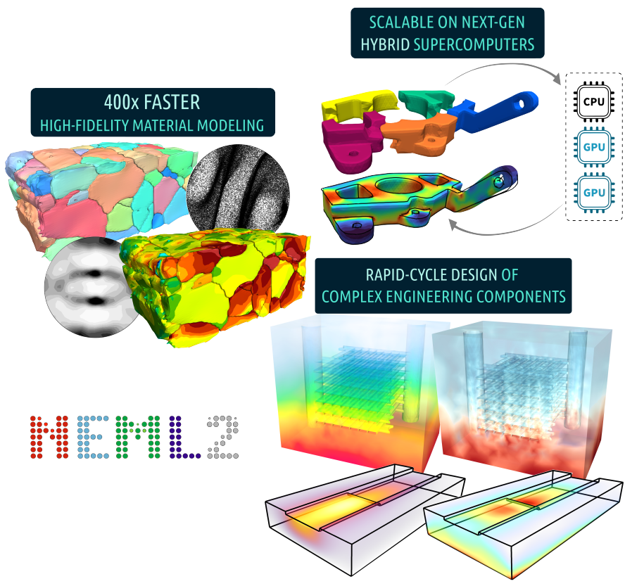 NEML2 is not tied to any underlying problem physics, e.g., solid mechanics, heat transfer, fluid dynamics, electromagnetics, etc. Current modules cover thermal and mechanical material models, but the framework can be used to implement a wider range of constitutive models. For coupled problems, NEML2 will return the exact, coupled Jacobian entries required to achieve optimal convergence. NEML2 can be used together with MOOSE, a Multiphysics finite element framework, to solve partial differential equations.